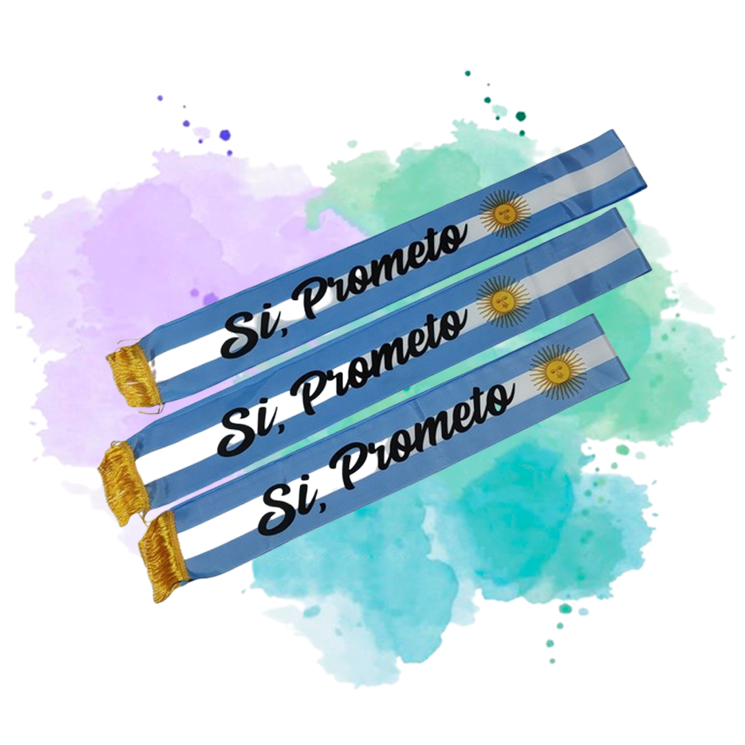 Cada banda lleva la frase “Sí, Prometo” en tipografía negra cursiva, destacándose sobre el fondo patrio. En uno de los extremos cuentan con flecos dorados que aportan un detalle elegante y ceremonial.