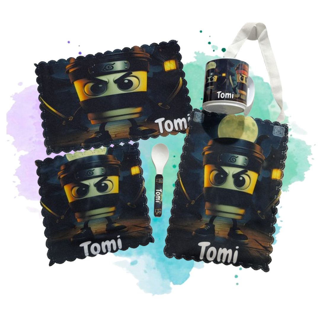 El diseño corresponde a una temática infantil inspirada en el universo ninja animado, adaptado para personalización. Ideal para regalos, cumpleaños, meriendas temáticas o rincones de juego donde se busca un producto original, llamativo y completamente personalizado.