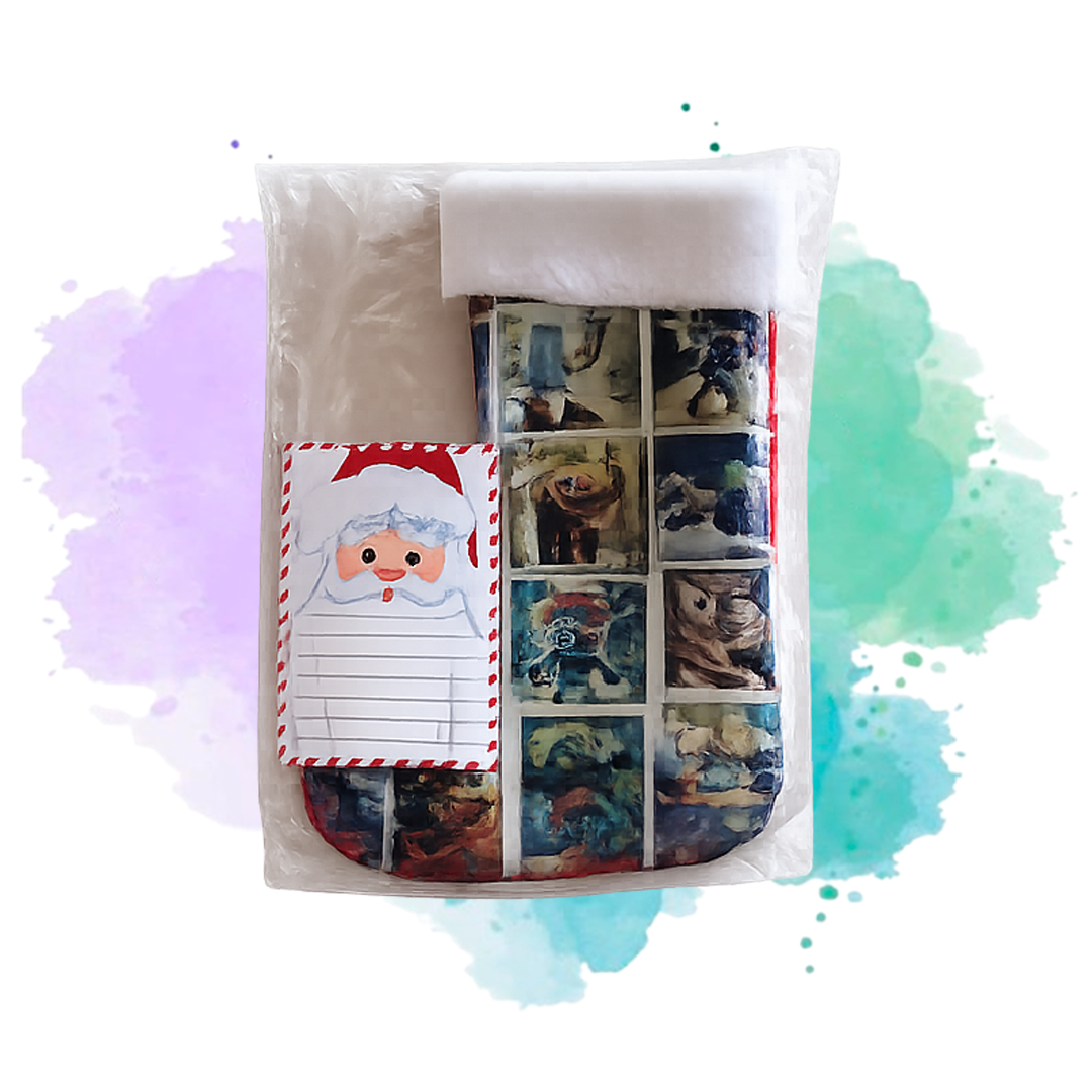Botita navideña confeccionada en tela estampada con diseño tipo collage en cuadros, que combina ilustraciones y escenas en tonos variados, logrando un estilo artístico y original. Su terminación superior en tela blanca tipo corderito aporta el clásico detalle navideño y un acabado suave.