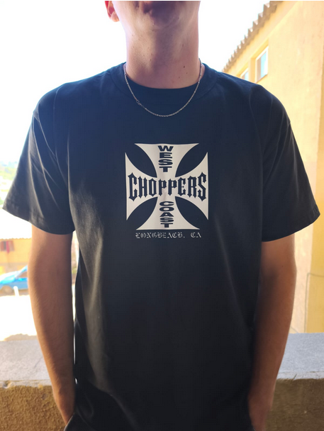 En el centro presenta el icónico emblema tipo cruz con la inscripción “West Coast Choppers” y detalle inferior “Long Beach, CA”, en tipografía blanca de alto contraste. El diseño transmite una estética biker/rock con fuerte personalidad y actitud.