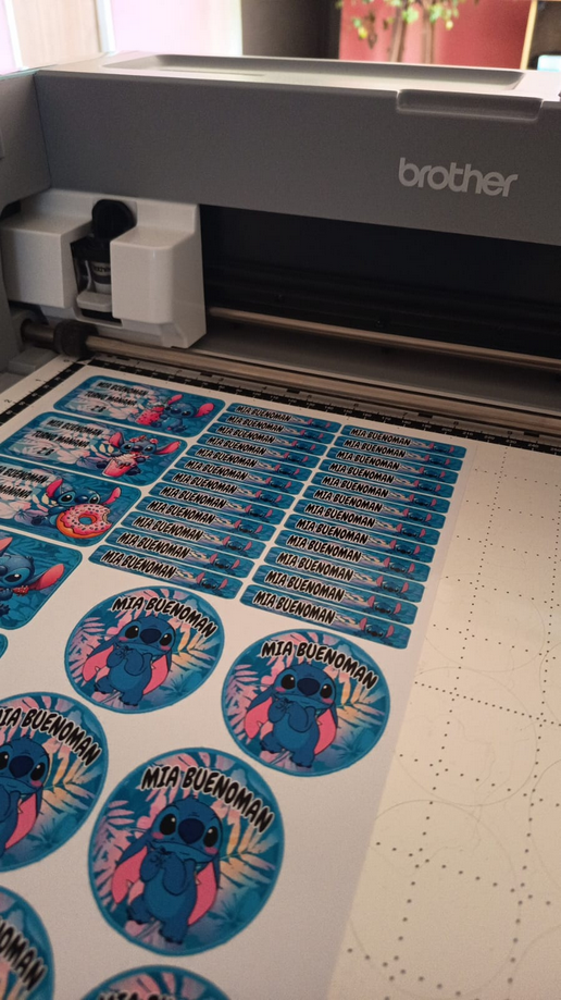 Stickers personalizados impresos en vinilo de alta calidad, ideales para darle un toque único y especial a los objetos de los más chicos. Este diseño presenta un estilo infantil súper tierno con ilustración tipo Stitch y nombre personalizado, perfecto para identificar útiles, decorar cuadernos, botellas, mochilas o lo que quieras.